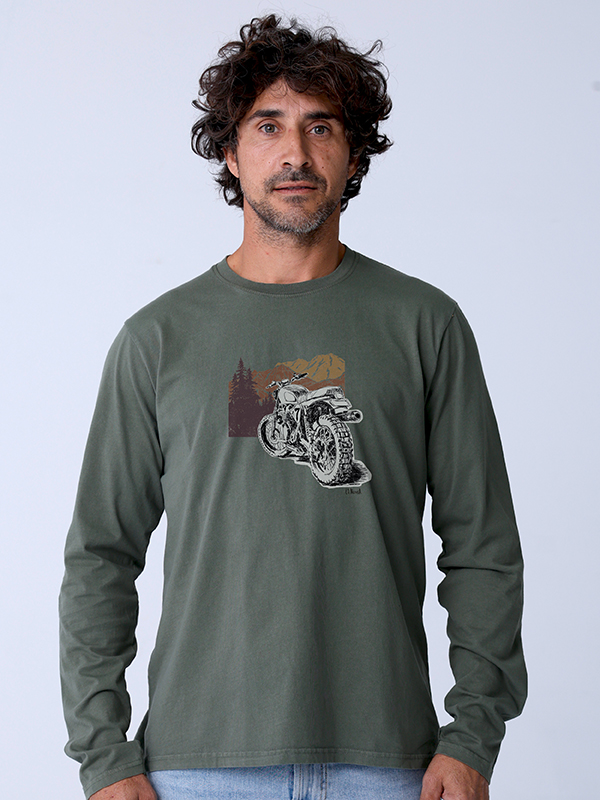 Camiseta masculina de manga larga en verde fresno con estampado exclusivo DIRT TRACK que evoca esas competiciones donde la destreza técnica se encuentra con la naturaleza salvaje, representando la adrenalina y libertad que solo se experimenta cuando las ruedas tocan la tierra. Fabricada en 100% algodón orgánico con tratamiento pigment dyed que evoca la adrenalina pura de las carreras en tierra.