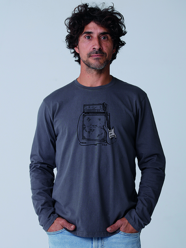 Camiseta masculina de manga larga en gris medio estampada con la ilustración de un amplificador vintage con estética retro que celebra la herencia musical del rock clásico. Fabricada en 100% algodón orgánico con tratamiento pigment dyed que evoca la época dorada del rock clásico.