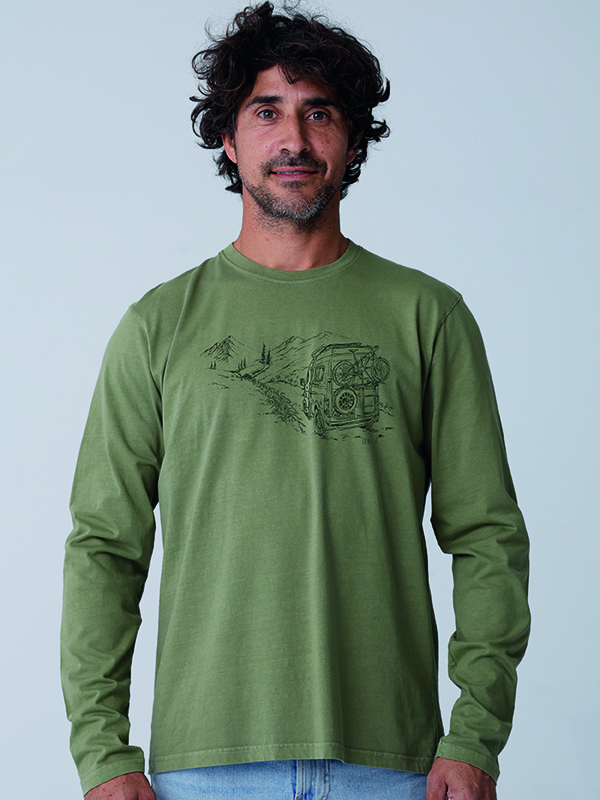 Camiseta masculina de manga larga en verde safari con estampación de una furgoneta camperizada navegando por paisajes montañosos, capturando la esencia pura del estilo de vida vanlife. Fabricada en 100% algodón orgánico con tratamiento pigment dyed que evoca el espíritu libre del estilo de vida vanlife.