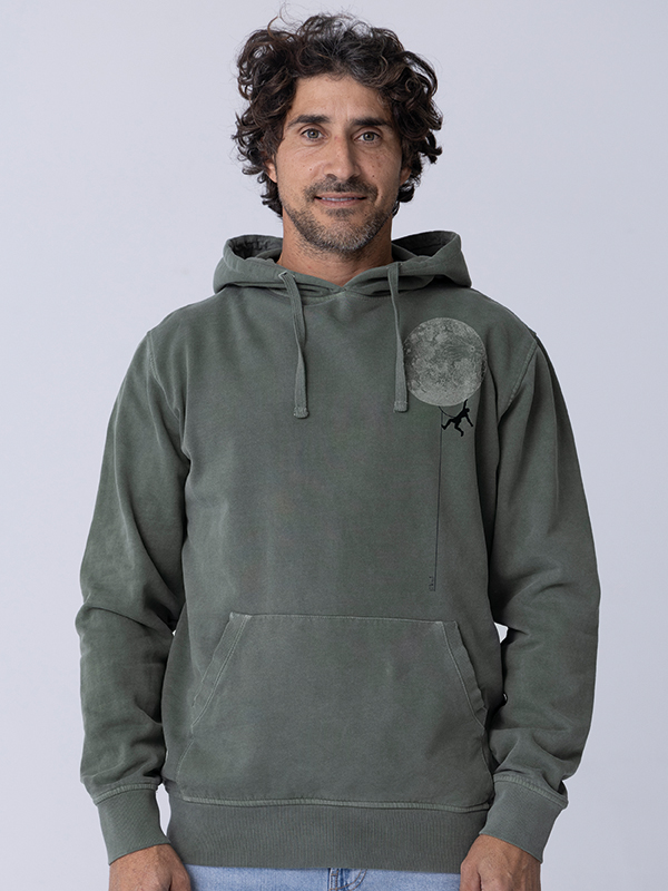 Sudadera masculina en verde fresno con diseño de un escalador conquistando la superficie lunar, simbolizando los sueños más ambiciosos y la determinación de alcanzar lo imposible. Fabricada en 100% algodón orgánico con tratamiento pigment dyed.
