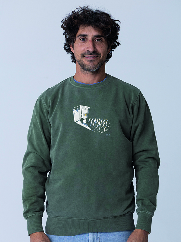 Sudadera masculina de cuello redondo en verde fresno con estampado exclusivo de pingüinos abriendo nevera con montañas nevadas. Fabricada en 100% algodón orgánico con tratamiento pigment dyed que aporta el auténtico look mediterráneo desgastado.