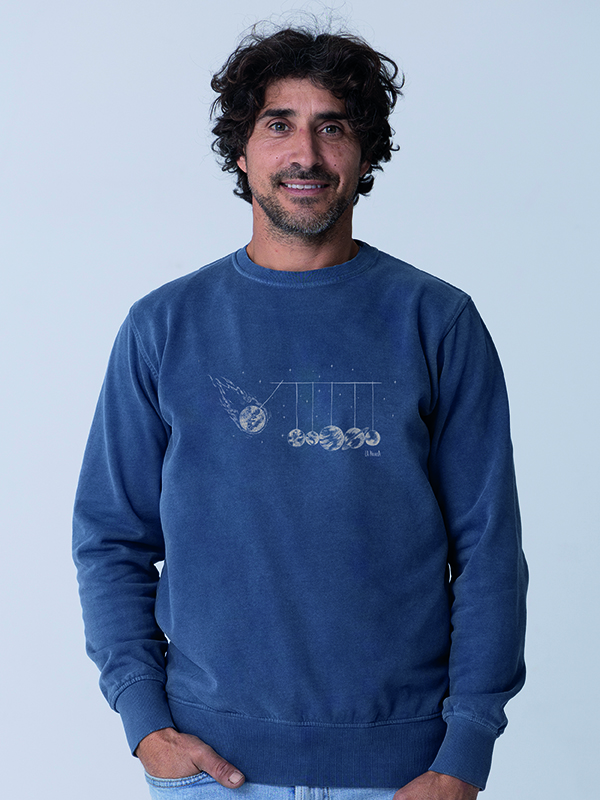 Sudadera de cuello redondo en azul noche con estampado del cometa Halley y péndulo de Newton, donde los ciclos cósmicos del cometa que regresa cada 76 años se encuentran con el movimiento perpetuo del péndulo. Fabricada en 100% algodón orgánico con tratamiento pigment dyed.