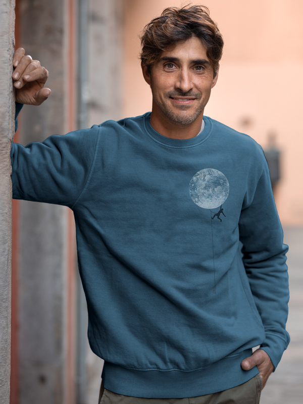 Cuando la ambición no conoce límites, nace esta sudadera masculina de cuello redondo en azul egeo con el audaz estampado de un escalador conquistando la luna. Confeccionada en 100% algodón orgánico con tratamiento pigment dyed, esta prenda captura la esencia de quienes sueñan en grande.