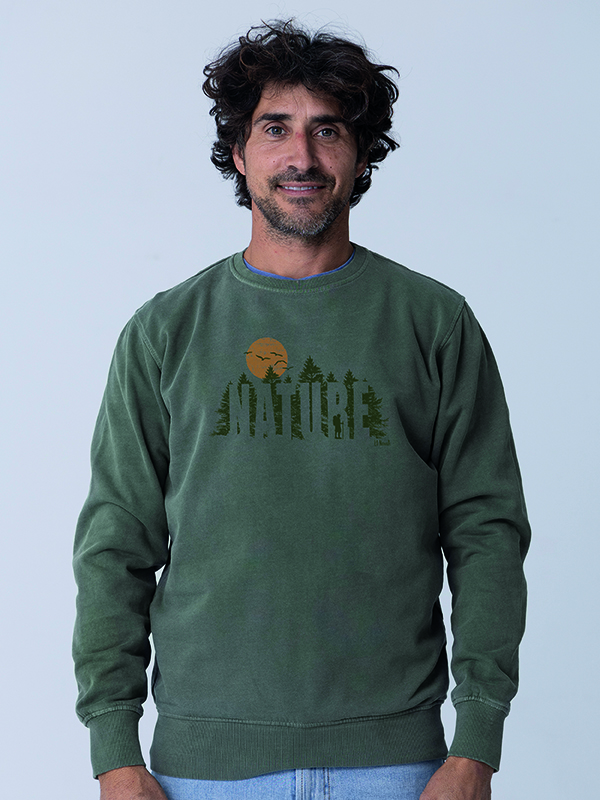 Sudadera de cuello redondo en verde fresno con estampado exclusivo de bosque al atardecer. Fabricada en 100% algodón orgánico con tratamiento pigment dyed que evoca la autenticidad de los paisajes mediterráneos.