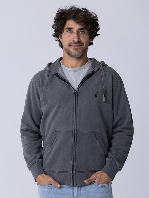 Sudadera masculina con capucha y cremallera. El bordado exclusivo de La Nansa en esta sudadera gris medio representa la perfecta fusión entre elegancia urbana y artesanía tradicional. Fabricada en 100% algodón orgánico con tratamiento pigment dyed que aporta sofisticación urbana y versatilidad premium.